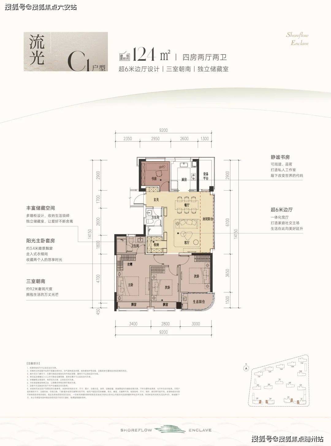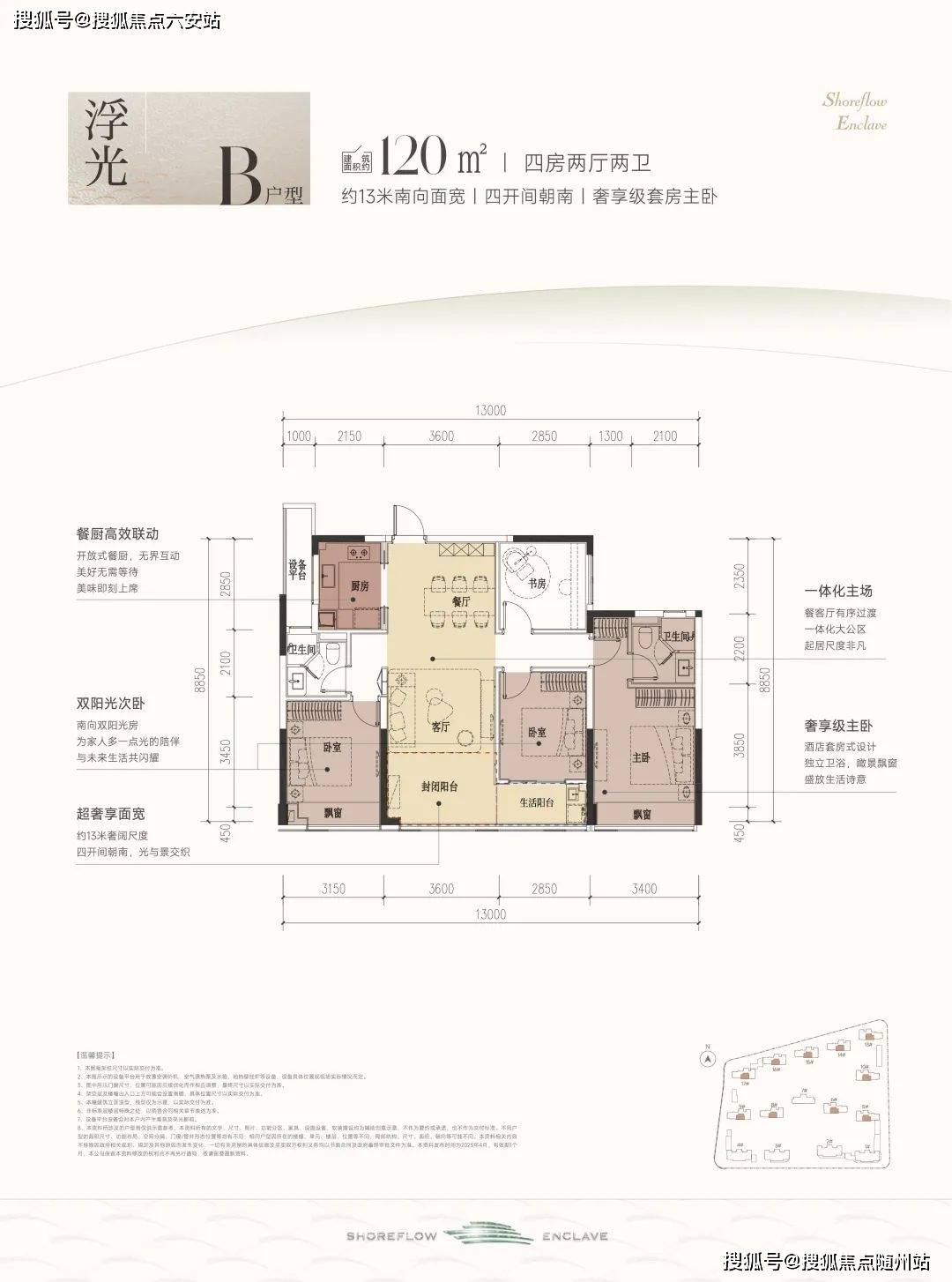 这款户型堪称四开间朝南的“流量王者”,南向面宽约13米,双联阳台+双飘窗设计,视野和采光优秀;套房主卧、双阳光次卧,颇有大平层的气势。